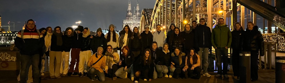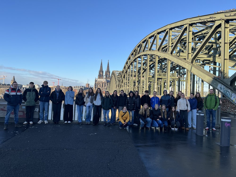 Vom 20. bis 22. November 2025 reiste das Gymnasium Himmelsthür mit 30 Schülerinnen und Schülern der Jahrgänge 9-12 mit der Bahn über Frankfurt in die Weltstadt Köln. Übernachtet wurde in der Deutzer Jugendherberge auf der rechten Seite des Rheins. Das frisch modernisierte Haus liegt verkehrsgünstig direkt neben dem Deutzer Bahnhof und Kölsch-günstig neben einem echten Kölner Original, dem Lommerzheim – was besonders Herrn Schilf positiv überraschte.