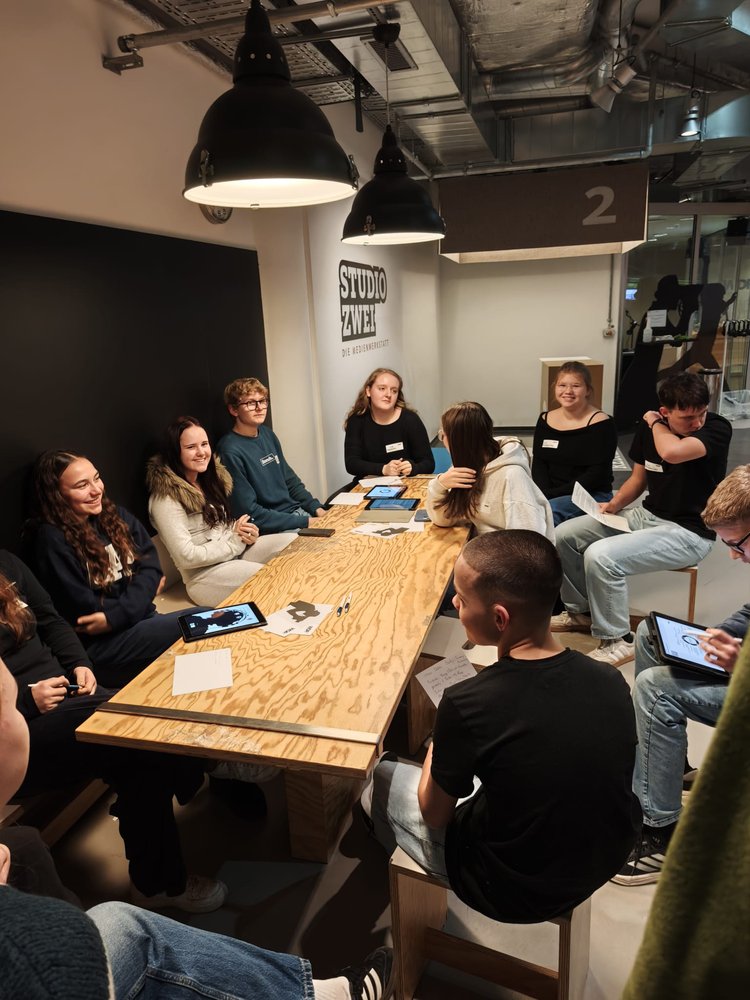 Nach der Anreise am Donnerstagmittag ging es zu Fuß (oder auf dem E-Scooter ;-)) über den Rhein, am Dom vorbei, zu den WDR-Arkaden, wo wir einen eigenen Radio- und Fernsehbeitrag konzipierten und in 3,5 Stunden produzierten. Das hat allen sehr viel Spaß gemacht. Unterstützt von jeweils fünf Redakteur*innen (das gesprochene Gendersternchen war den Mitarbeitenden hier sehr wichtig…) haben wir unsere eigene Sendung aufgenommen.