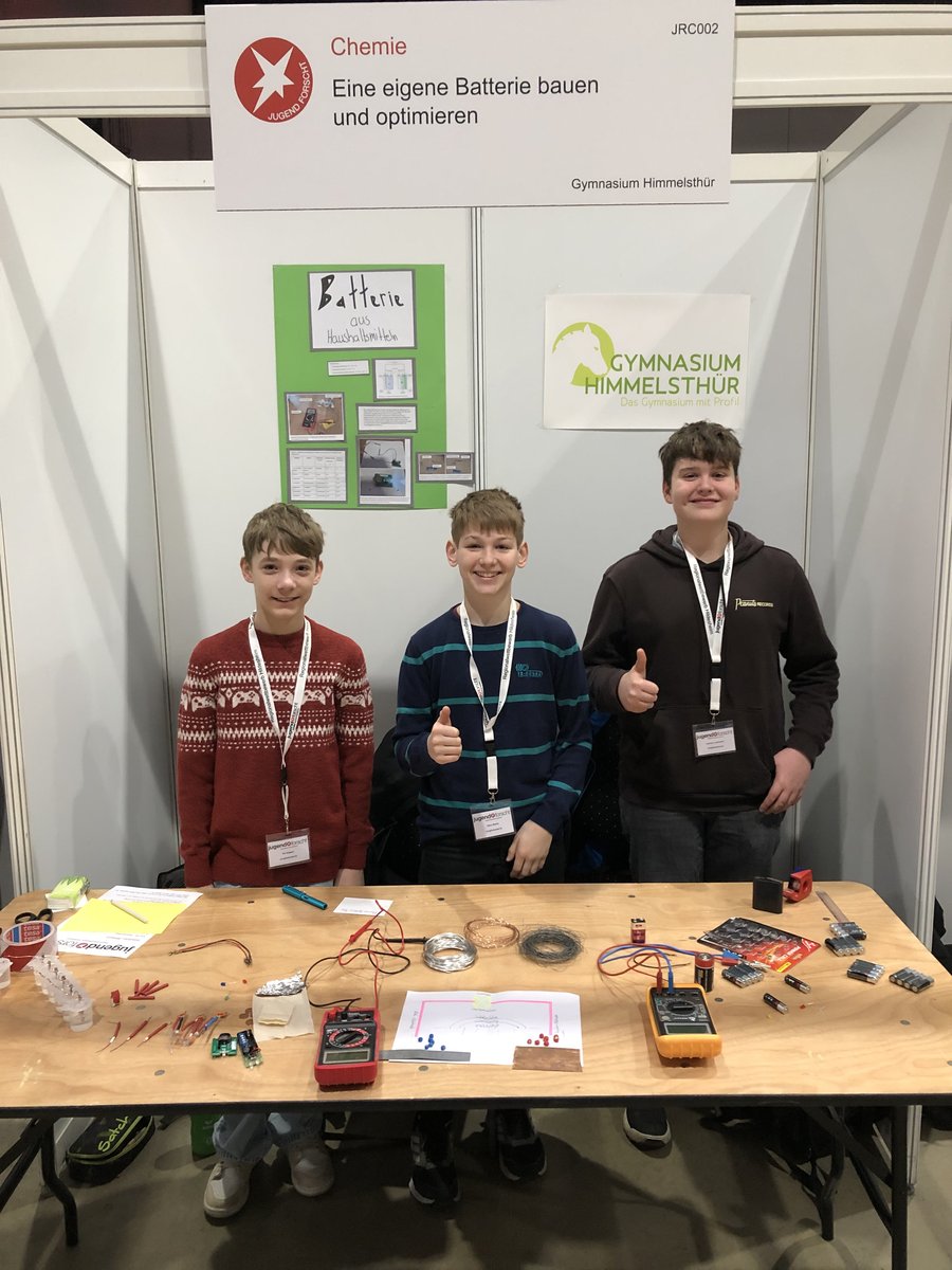Im Fachgebiet Chemie haben sich Till, Gero und Laurenz aus der 7a mit selbstgebauten Batterien beschäftigt und haben dafür den ersten Preis erhalten.