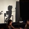 Mit Hilfe eines Tageslichtprojektors wurden in einem anderen Raum eindrucksvolle Schattentheaterstücke gezeigt. Die Schülerinnen hatten hierfür Figuren aus Papier gestaltet, die, auf Holzspießen befestigt, szenisch agierten und deren Schatten auf der Leinwand zu betrachten war. Die Geschichten, die ihre Figuren in den gezeigten Szenen erlebten, hatten die Schülerinnen selbst geschrieben und beruhten auf Erzählungen aus dem Deutschbuch.