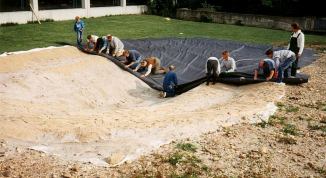 Die Folie liegt im Teich. Nun werden 3-5 cm Sand - Lehm - Gemisch auf den Teichboden gefüllt. Das Substrat auf der 1. und 2. Pflanz- terrasse wird erst eingebracht, wenn der Wasserspiegel beim Füllen des Teiches die jeweilige Terrasse erreicht hat, da sich die Folie | durch den Wasserdruck setzt. Auf die Pflanzterrassen werden 10 cm Sand - Lehm - Gemisch gefüllt. Beim Einlassen des Wassers wird davon ein Teil auf die Hangbereiche im Teich geschwemmt. Diese dünne Substratschicht schützt die Folie vor der UV - Strahlung. |
