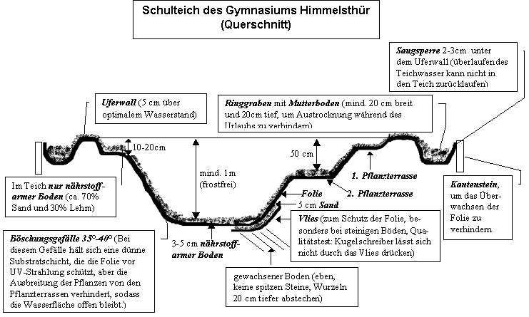 BauanleitungDer oben abgebildete Querschnitt zeigt den Aufbau unseres naturnah gestalteten Teiches und gibt wichtige Hinweise zum Bau eines pflegeleichten Teiches. Folgende Hinweise sollten unbedingt beachtet werden: